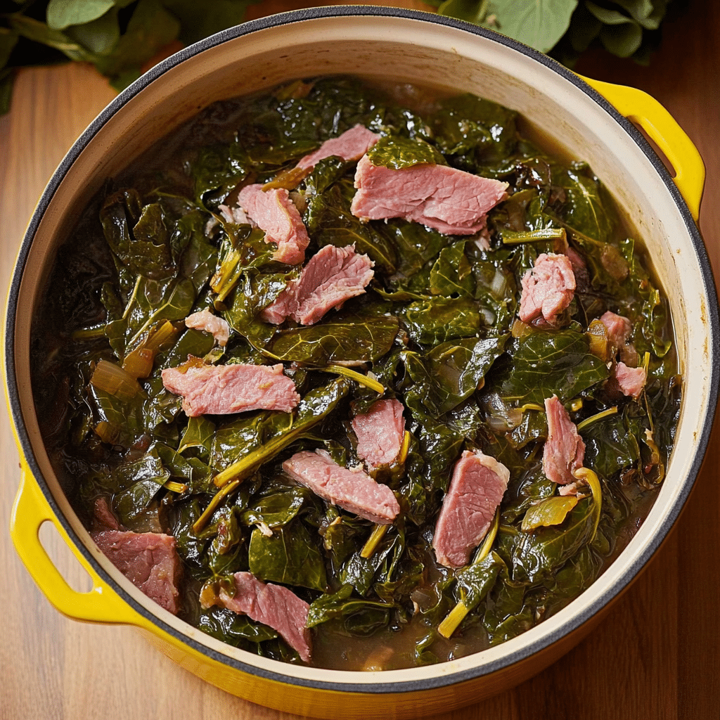 Ingredients 2 large bunches collard greens (about 2 lbs) 1 smoked ham hock or 1 or 2 cups chopped smoked ham 1 small onion (chopped) 2 or 3 cloves garlic (minced) 4 cups chicken broth (or water) 1 tablespoon olive oil ½ teaspoon salt (adjust to taste) ½ teaspoon black pepper ½ teaspoon red pepper flakes (optional) 1 tablespoon apple cider vinegar (optional, for brightness)